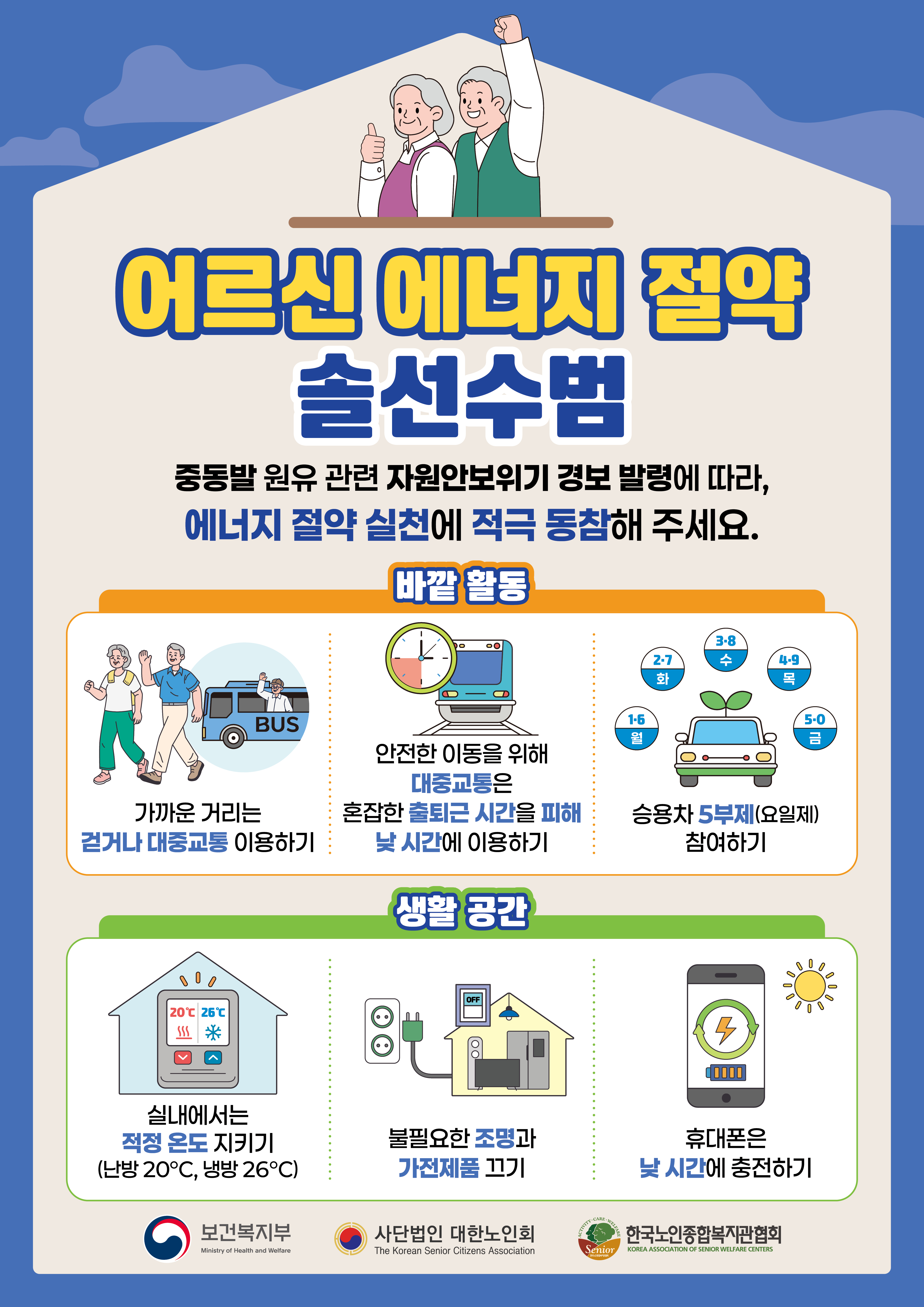 보건복지부, (사)대한노인회 및 한국노인종합복지관협회가 함께하는‘어르신 주도 에너지 절약 실천 캠페인’이 4월 한 달간 전국적으로 진행됩니다.이번 캠페인은 일상 속 에너지 절약 실천을 확산하기 위해 ▲대중교통 이용 ▲걷기 생활화 ▲적정 실내온도 유지 ▲승용차 5부제 참여 등 다양한 실천 수칙을 중심으로 운영됩니다.동백꽃노인종합복지관에서도 에너지 절약 실천 문화 확산을 위해포스터 게시 및 안내를 진행하오니, 많은 관심과 참여 부탁드립니다.감사합니다.