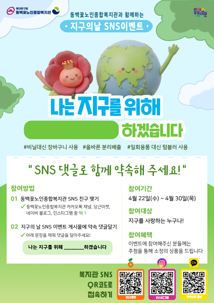 4월 22일, 지구의 날을 맞아 동백꽃노인종합복지관이 특별한 약속 이벤트를 준비했습니다. 댓글 하나로 지구를 지키는 약속에 동참해 주세요🌱 추첨을 통해 소정의 상품도 드립니다!