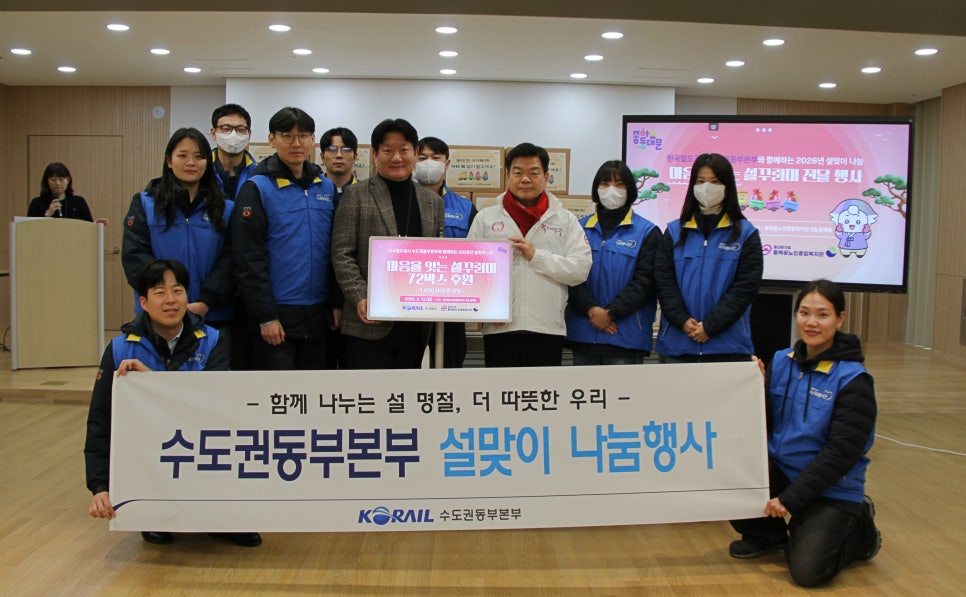 동대문구립 동백꽃노인종합복지관(관장 남궁행)은 13일 오전 10시 복지관 2층 동백홀에서 한국철도공사 수도권동부본부(본부장 김태훈)의 후원으로 '설맞이 마음을 잇는 설꾸러미 전달행사'를 진행해 이필형 구청장과 남궁행 관장, 코레일 임직원 등이 참석한 가운데 독거 어르신 72가정에 명절 식품 6종으로 구성된 100만 원 상당의 설꾸러미를 직접 전달하고 안부를 살폈다...더보기