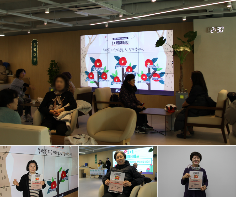 11월 18일(화), 동백꽃노인종합복지관 1층 라운지에서 ‘1+1 함께데이’ 후원행사를 진행하였습니다.