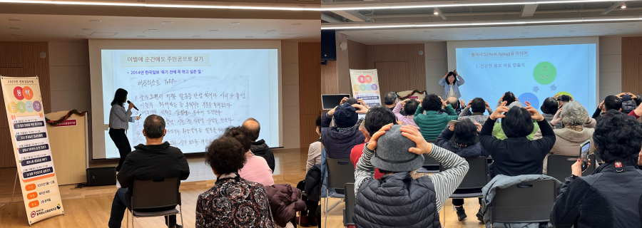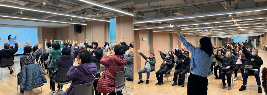 2025년 12월 19일(금) 복지관 2층 동백홀에서 복지관 회원 39명을 대상으로 웰다잉 특강 「내 삶의 주인공으로 살아가기」를 진행했습니다. 이번 특강은 리스타트 대표 이지원 강사와 함께 웰다잉(Well-Dying)을 주제로 행복한 삶의 마무리와 존엄한 노년의 삶에 대해 함께 생각해보는 시간으로 마련되었습니다. 강의는 ‘뇌가 좋아하는 춤’ 건강체조로 가볍게 몸과 마음을 깨우며 시작되었고, 이후 존엄한 삶과 노년기 삶의 준비를 주제로 강의가 진행되었습니다.