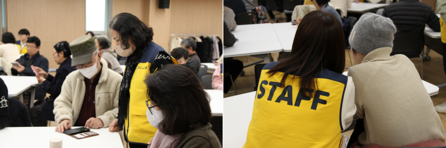 특히 동년배 디지털 활동가 어르신들이 한 테이블에 한 분씩 함께하며 1:1로 도와주다 보니