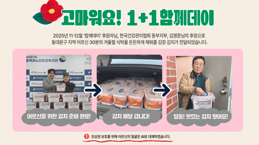 1+1 함께데이 후원을 통해 동대문구 내 도움이 필요한 어르신 30분께 정성껏 준비한 김장김치를 직접 전달하였습니다. 이번 나눔은 단순한 물품 전달을 넘어, 어르신 한 분 한 분의 안부를 살피고 마음을 나누는 소중한 시간이었습니다. 동백꽃노인종합복지관 직원들은 김장김치를 전달하며 어르신들의 건강과 일상을 살피고, 짧지만 따뜻한 대화와 인사를 나누었습니다.