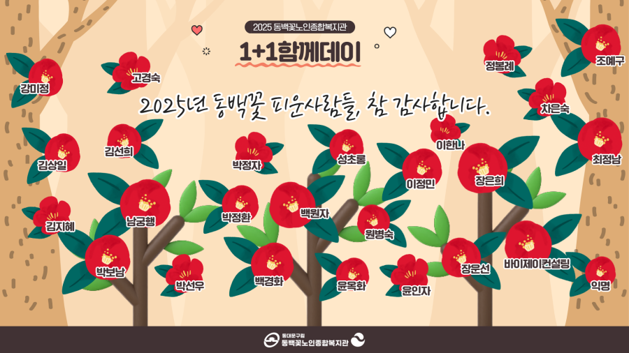 2025년 동백꽃노인종합복지관에서 진행된 1+1 함께데이 후원 행사는 지역 어르신들을 위한 따뜻한 나눔과 소통의 장으로 진행되었습니다.