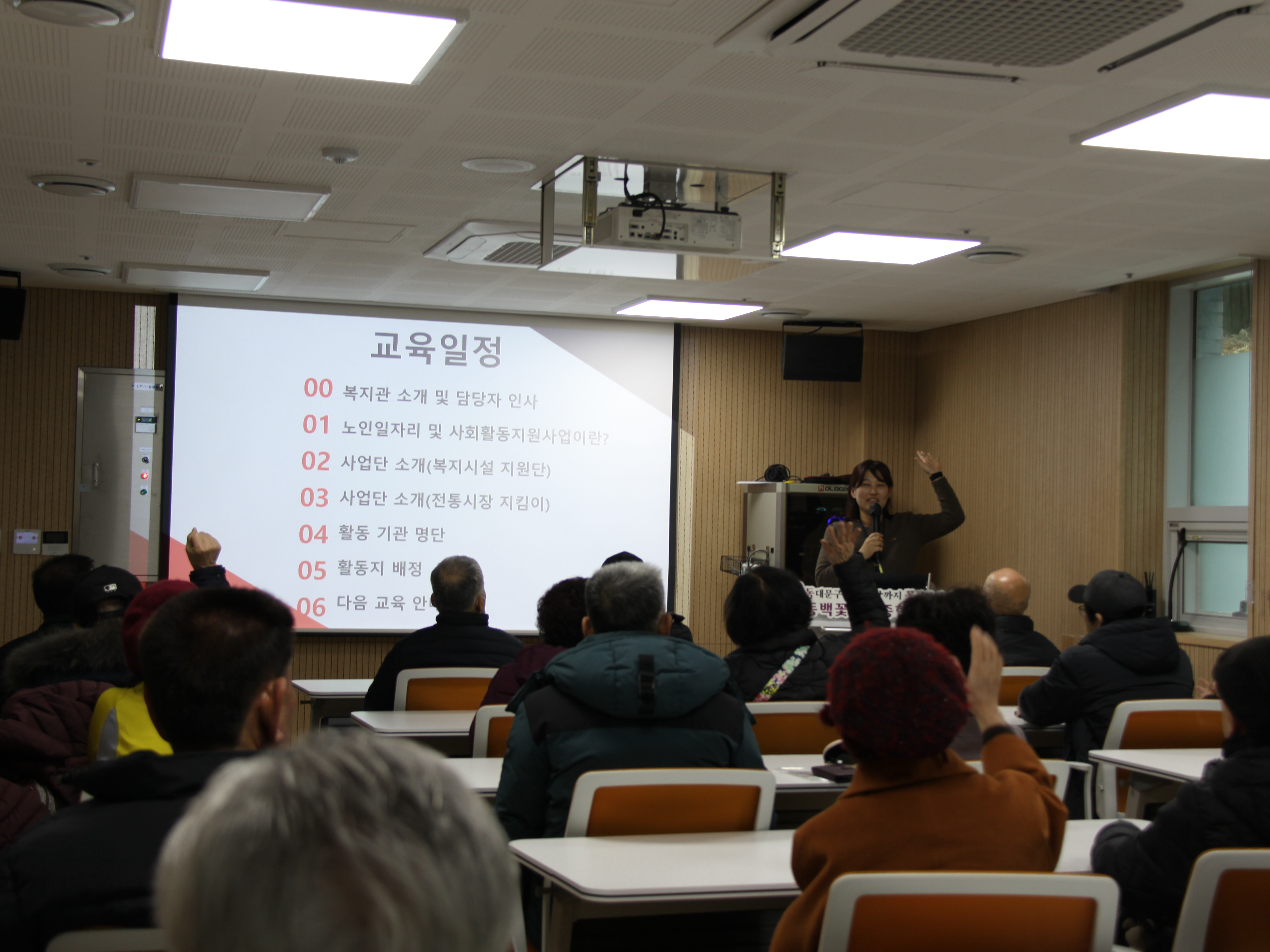 이번 교육은 참여 어르신들이 각 일자리사업의 목적과 역할을 정확히 이해하고, 지역사회 안에서 자신의 경험과 지혜를 나누며 보다 안전하고 보람 있게 활동하실 수 있도록 돕기 위해 마련되었습니다. 교육에 앞서 남궁행 관장님께서는 "노인일자리가 어르신 한 분 한 분의 일상에 활력을 더하고, 삶의 보람과 자긍심을 느낄 수 있는 시간이 되길 바란다" 며 "무엇보다 안전을 최우선으로 한 활동이 되기를 바란다"는 말씀을 전해주셨습니다.