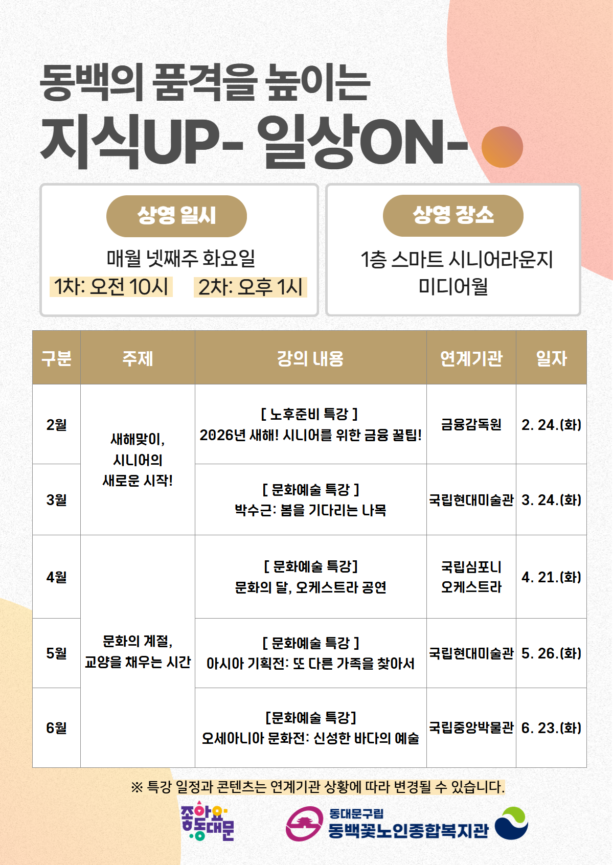 이번 3월 상영회에서는 국립현대미술관에서 제작한 [박수근: 봄을기다리는 나목] 영상을 공개 상영하며, 어르신들께서 일상 속 디지털 서비스를 활용하여 문화예술 콘텐츠를 쉽고 편리하게 접하실 수 있도록 지원하였습니다. 자유롭게 머무는 공간에서 집중하며 시청하시는 모습이 인상적이었으며, “앞으로 이런 시간이 많이 있었으면 좋겠다.”, “미술관에 가기 어려운데 이렇게 볼 수 있어서 너무 좋았다”는 긍정적인 반응도 확인할 수 있었습니다. 본 상영회는 어르신들이 일상 속에서 디지털 기기를 기반으로 다양한 정보와 콘텐츠를 자연스럽게 접할 수 있도록 지원하기 위한 목적으로 운영되고 있으며, 앞으로도 매월 넷째 주 화요일, 오전 10시와 오후 1시 하루 두 차례 공개상영회로 지속 운영될 예정입니다. 동백꽃노인종합복지관은 문화예술, 디지털, 건강정보 등 다양한 영역의 콘텐츠를 통해 어르신들의 일상에 꼭 필요한 정보를 전해드리겠습니다. 동백꽃 회원님들의 많은 관심과 적극적인 참여 부탁드립니다 🌼 |