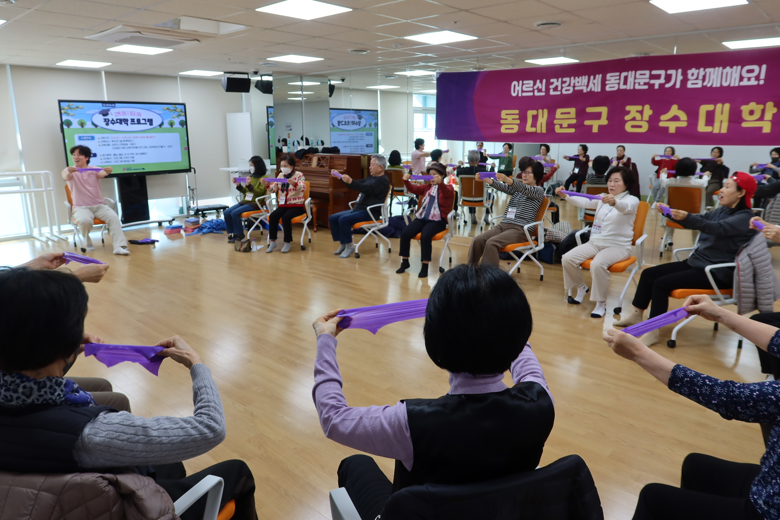 2026년 3월 4일(수) 14:00~14:50, 복지관 3층 동백학당2에서 동대문구보건소 건강장수팀 연계로 '근력증진을 위한 장수대학' 건강증진 프로그램을 진행했습니다.