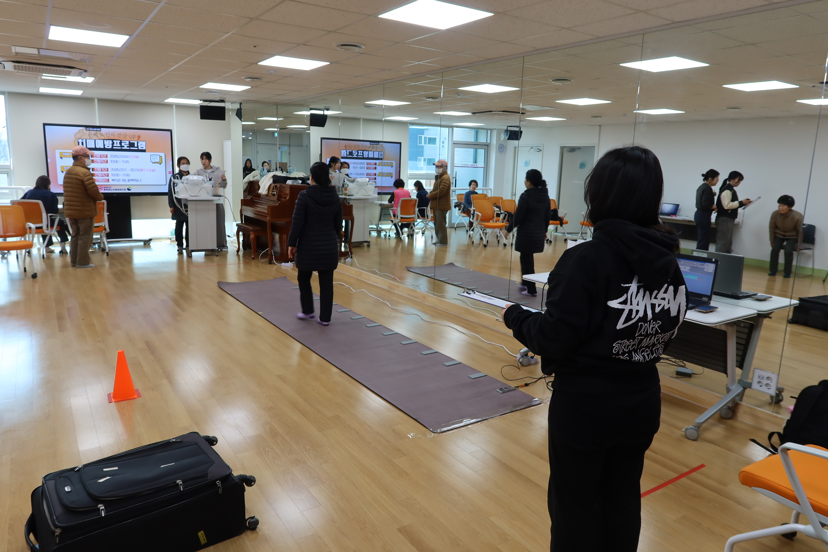 프로그램 진행 전에 치매 예방을 희망하는 참여자들 대상으로 삼육대학교 물리치료학과 봉사자의 협조로 치매 검사와 건강측정을 진행하고 대상자를 선정하여 치매예방 프로그램 1회기가 시작되었습니다. 프로그램은 총 10회기로 진행되며 프로그램 종료 이후, 사후측정으로 치매 검사와 건강측정을 다시 진행하여 프로그램 전과 후의 효과를 확인할 예정입니다.