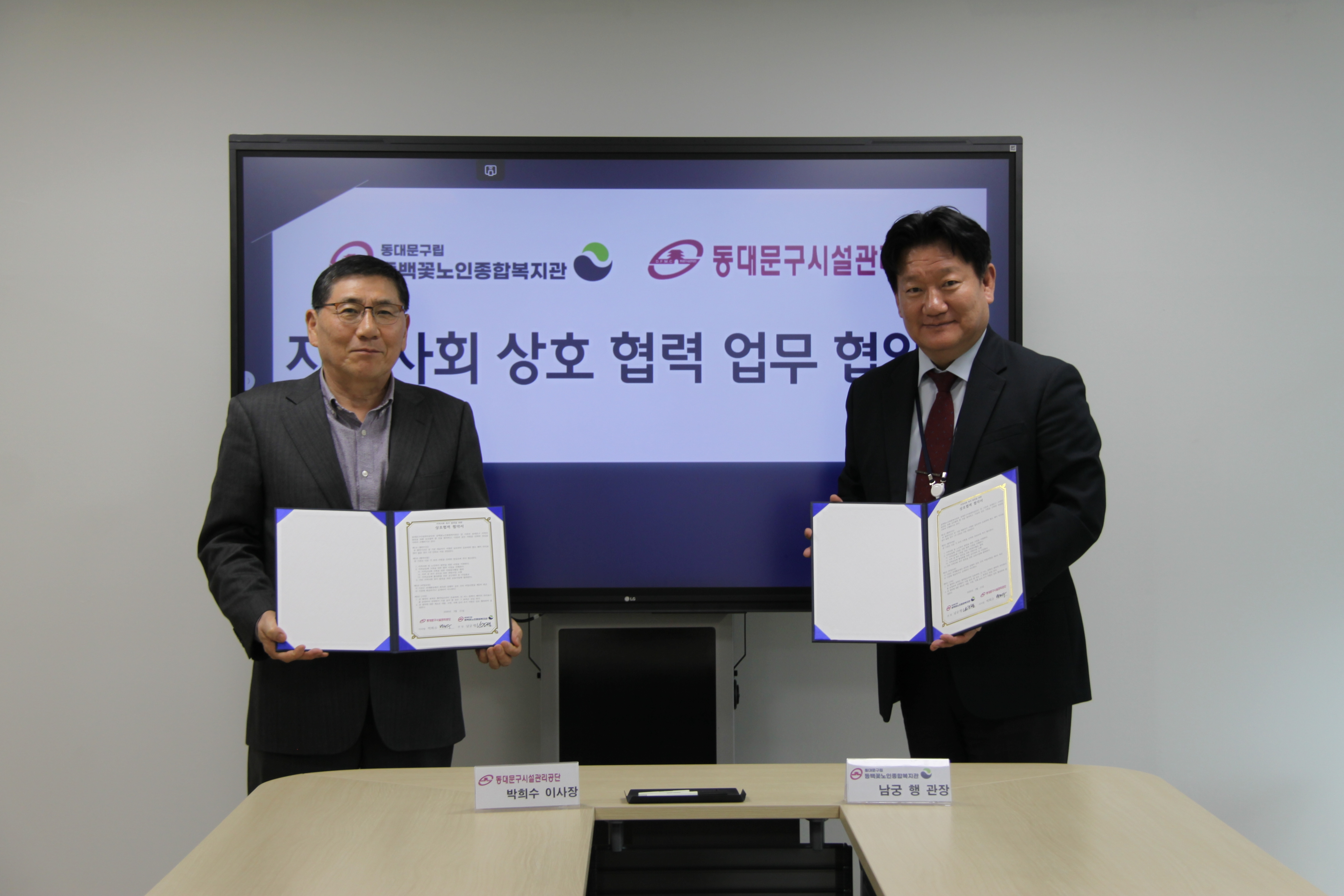2026년 3월 31일, 동백꽃노인종합복지관(관장 남궁행)은 동대문구 시설관리공단(이사장 박희수)과 지역 내 공공시설을 기반으로 어르신 대상 자원봉사 및 복지서비스를 확대하고, 기관 간 협력체계를 구축하기 위해 업무협약을 체결하였습니다. 이번 업무협약을 통해 복지관 사업 및 프로그램에 대한 홍보를 지역주민이 이용하는 공공시설과 연계하여 적극 추진함으로써, 지역사회 전반에 복지정보 접근성을 높이고 참여 기회를 확대해 나갈 계획입니다. 또한 시설관리공단 내 전문인력을 활용하여 재능기부 기반의 자원봉사활동을 활성화하고, 어르신을 위한 다양한 프로그램을 연계·확대해 나갈 예정입니다. 이를 통해 동대문구 시설관리공단은 지역사회 공공기관으로서 복지 실천의 역할을 강화하고, 동백꽃노인종합복지관은 어르신의 건강하고 활기찬 노후생활을 지원하는 데 최선을 다할 수 있도록 하겠습니다. |
