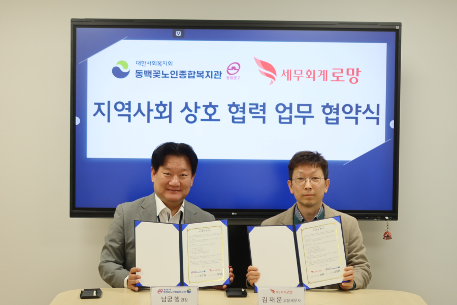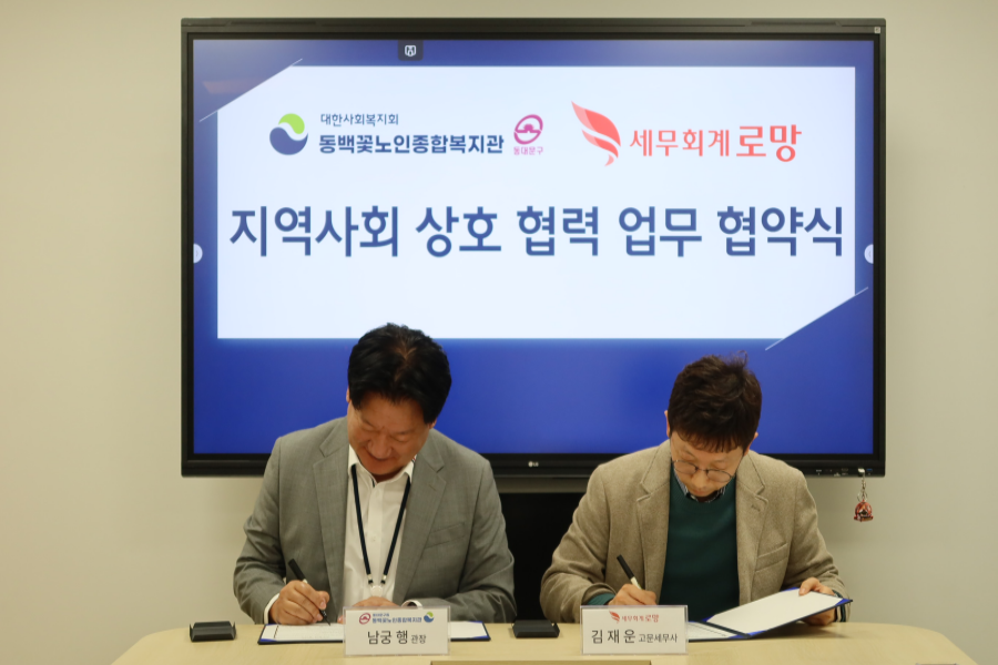 2026년 4월 9일(목), 동백꽃노인종합복지관(관장 남궁행)은 세무회계 로망(고문세무사 김재운)과 지역사회 어르신을 위한 세무 전문 서비스 지원을 목적으로 업무협약을 체결하였습니다. 이번 협약은 세무회계 분야의 전문 인적자원을 지역사회에 공유하고 재능기부 기반의 사회공헌 활동을 활성화하기 위해 추진되었습니다. 세무회계 로망은 전문 세무사의 참여를 통해 어르신들에게 무료 세무상담을 제공하고 복잡한 세무 문제에 대한 이해를 돕는 등 실질적인 도움을 지원할 예정입니다. 2026년 2월 진행된 무료 세무상담을 시작으로 양 기관은 협력 기반을 구축하였으며 이번 협약을 통해 보다 안정적이고 지속적인 서비스 운영이 가능해졌습니다. 양 기관은 앞으로도 상호 협력을 통해 지역사회 어르신들의 경제적 안정과 삶의 질 향상에 기여할 수 있도록 노력하겠습니다. 동백꽃노인종합복지관은 지역사회 전문기관과의 협력을 통해 어르신들의 안정적이고 행복한 노후생활을 지원하는 데 최선을 다하겠습니다. |